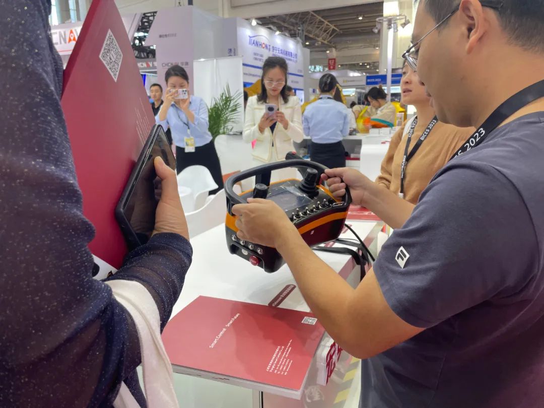 無人化也是本次展會的核心之一,在展臺另一側(cè),多款無線遙控設備也得到了客戶的廣泛關(guān)注。eTelecom系列遙控系統(tǒng),發(fā)射器面板可根據(jù)客戶的功能需求進行非標定制,面板可以安裝單軸遙控、雙軸遙控、電位計、選擇開關(guān)、撥動開關(guān)等。不僅品質(zhì)可靠,并且采用符合人體力學的腰跨式設計,在工程機械、林業(yè)機械、港口機械等領(lǐng)域廣泛應用。